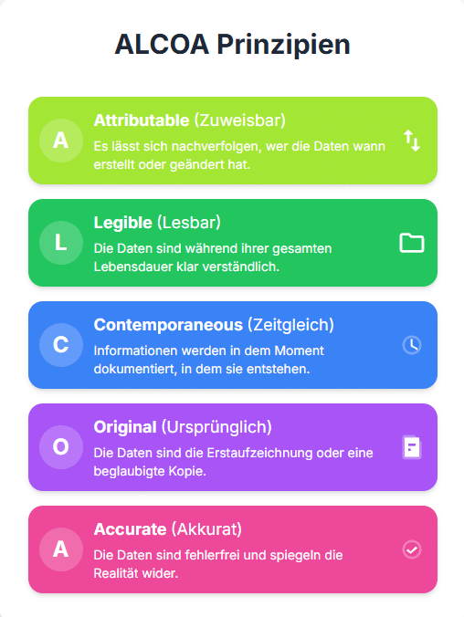 In der Pharmaindustrie: Hier sind die Grundsätze der Datenintegrität nach ALCOA ein etablierter Standard. ALCOA steht für Attributable (zuordenbar), Legible (lesbar), Contemporaneous (zeitnah erfasst), Original (in originaler Form) und Accurate (präzise). Diese Prinzipien stellen sicher, dass Daten nachvollziehbar und verlässlich sind. Folgende Grafik erklärt dieses Prinzip genauer: